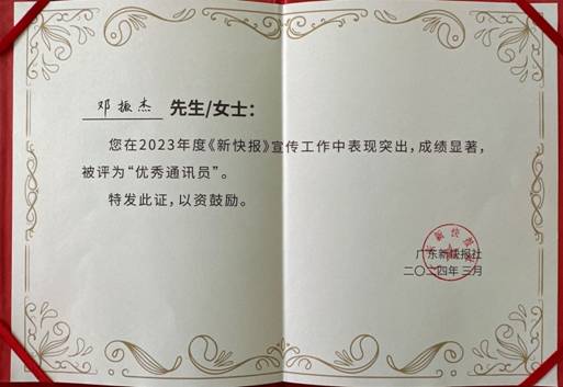 近日,广东省新快报社在羊城创意产业园举行“遇见•预见”新快报2024年度通讯员大会,来自省、市、区及各行业部门的众多通讯员代表们到场参加,其中广州轻工集团开云网页版外派干部邓振杰同志在2023年度《新快报》宣传工作中表现突出,成绩显著,被评为“优秀通讯员”。