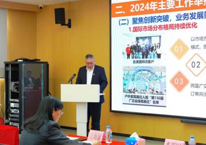 公司党支部书记、董事长周逊姜以《务实谋新提质效,深化改革促发展》为题作工作报告。报告从聚焦主业、赋能蓄力、培根铸魂三个方面总结了公司2024年的工作情况。2024年,广纺联公司统筹抓好地块交储、物业管理等多项工作,公司实现营业收入完成预算目标值103%;利润总额完成预算目标值156%。报告指出,2025年广纺联公司将围绕广州轻工集团及开云网页版的总体部署,紧扣“数智领航链全球,提质增效建新功”的工作主题,从紧盯主责主业、提升改革深化、坚持党建引领、加强风险防范、强化人才队伍建设等五大方面推动经营工作实现质的有效提升。